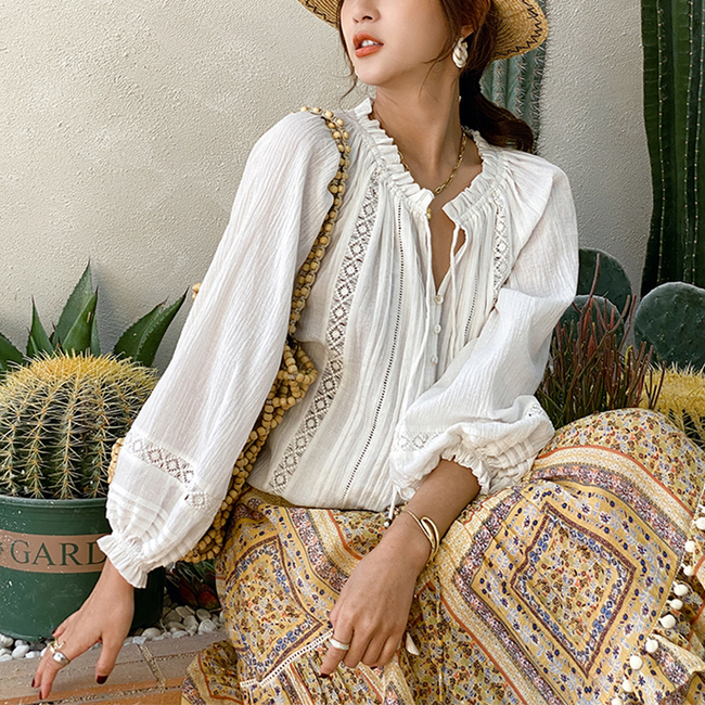 Design: Solid Color, Long Sleeve, Loose Fit, Pintucks , Lace Applique